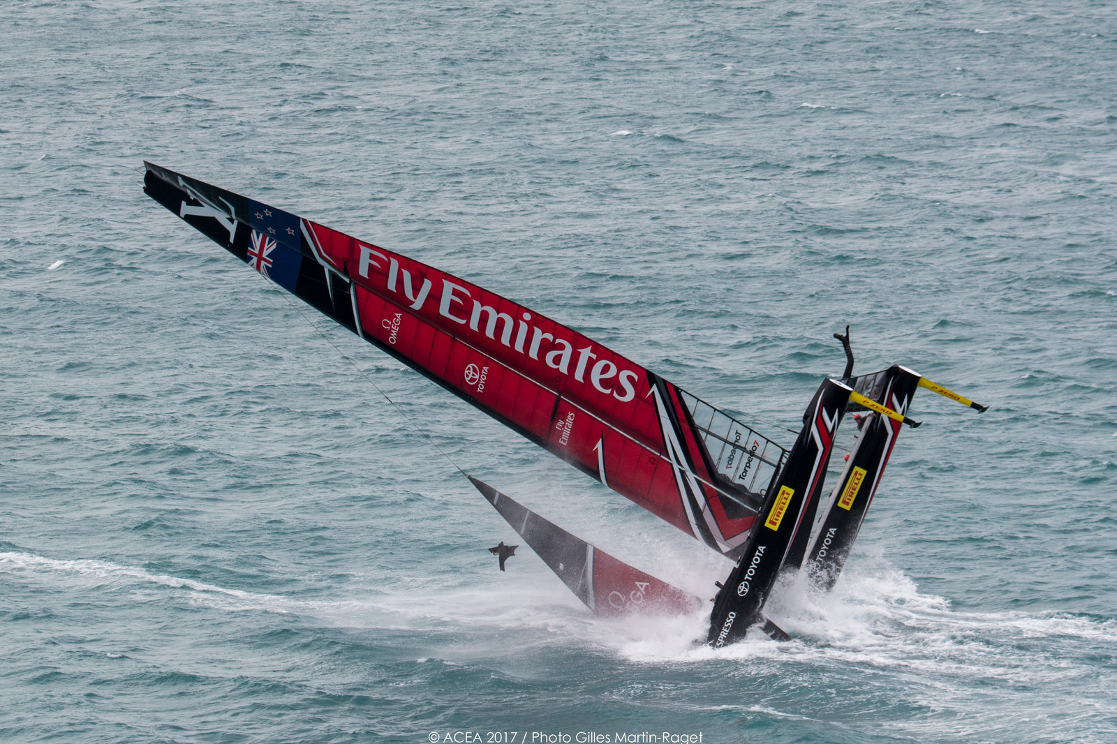 The second day of the Challenger semi-finals proved no exception – with Emirates Team New Zealand violently pitchpoling before the start of their race against Sir Ben Ainslie and Land Rover BAR.